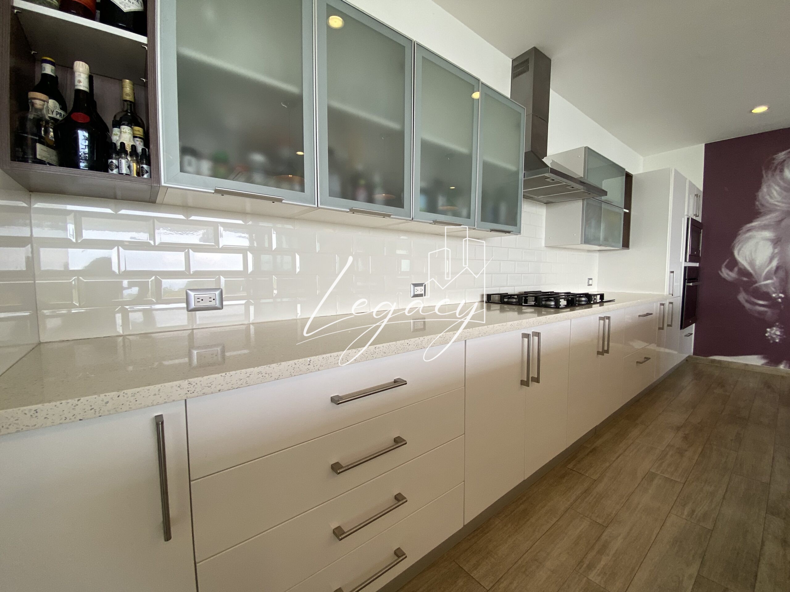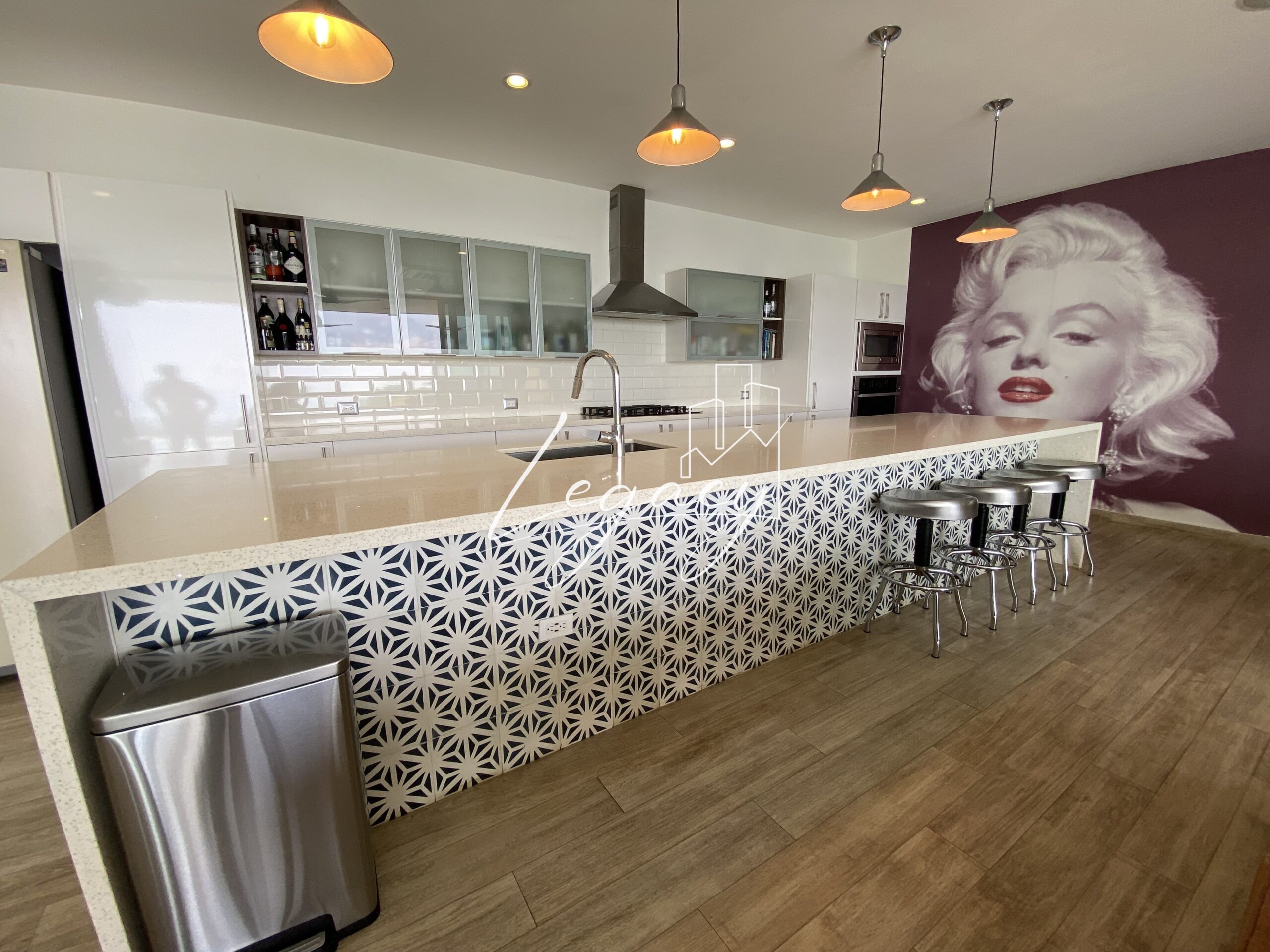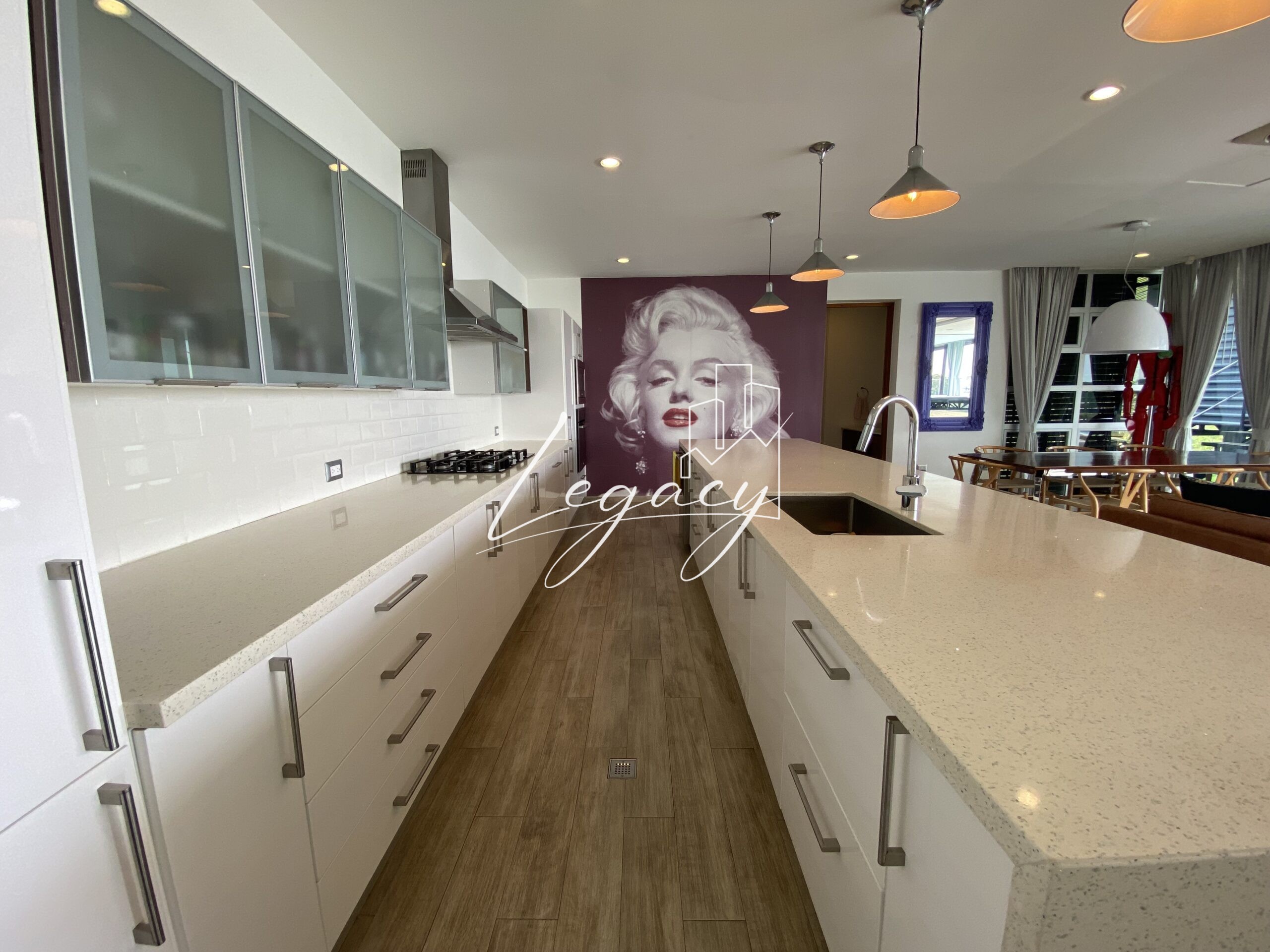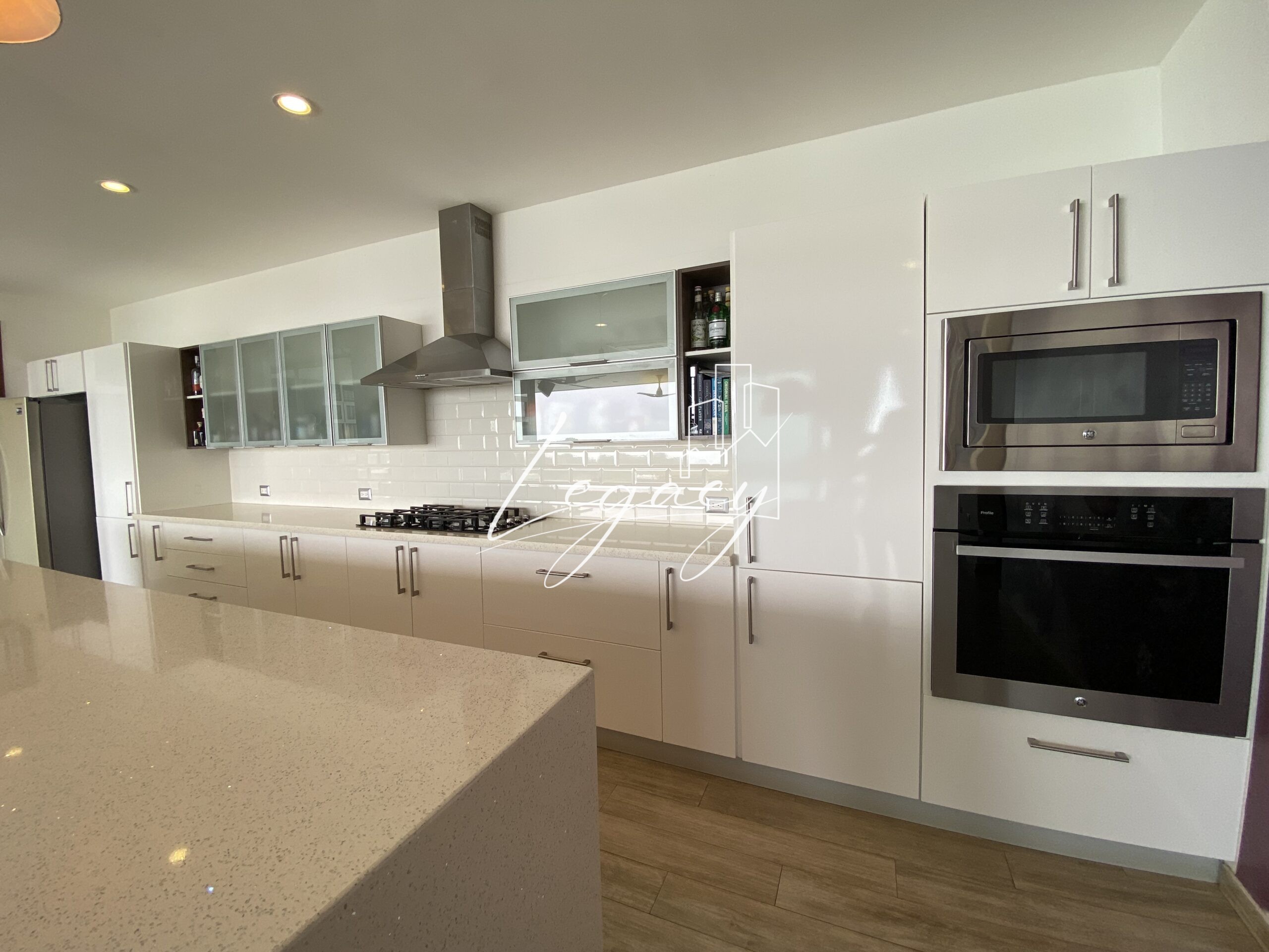 Cocina espaciosa con finos acabados y excelente iluminación natural.